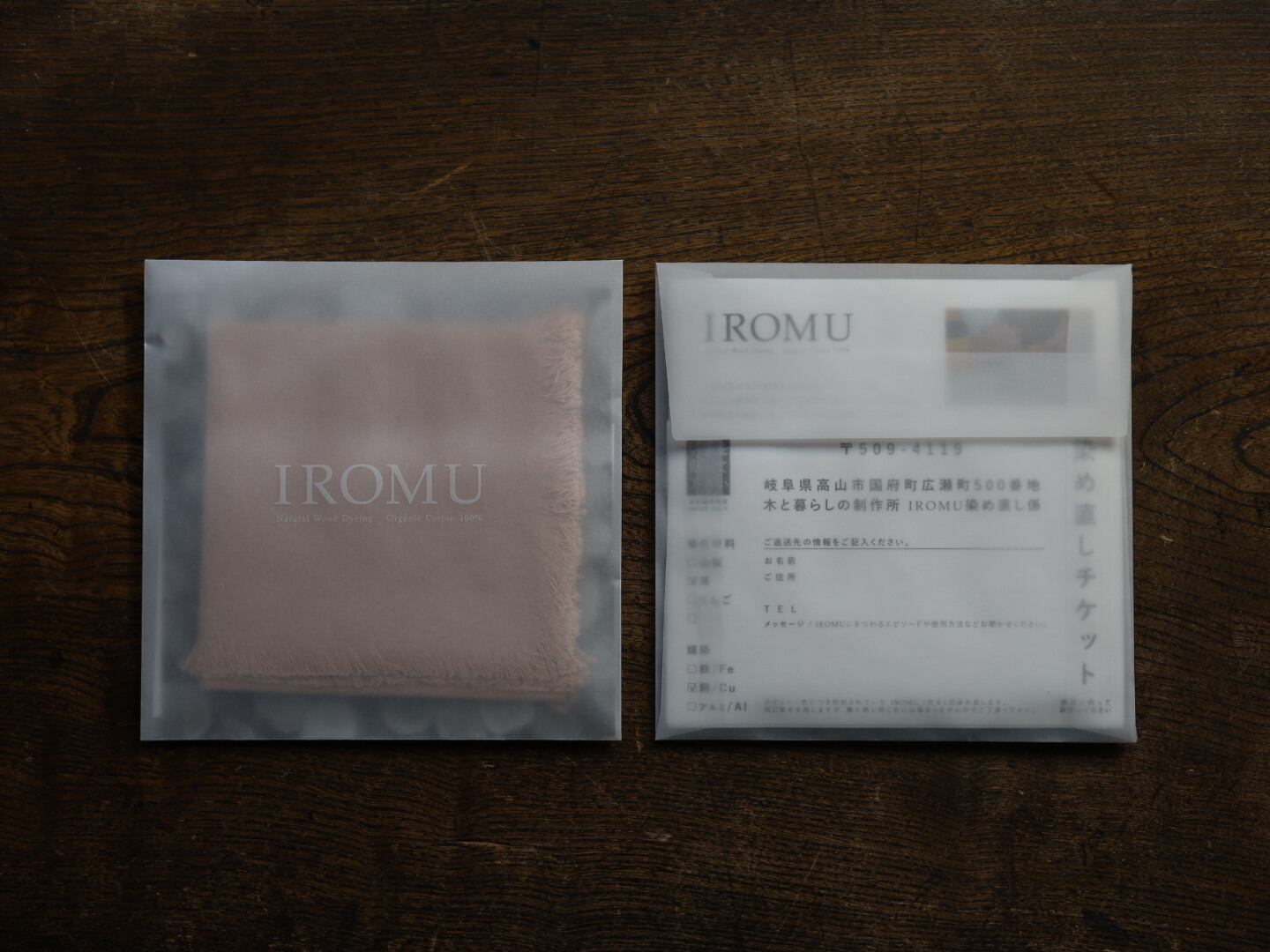 化学染料とは異なり色落ちしやすい素材ですが、染め直しチケット付きで、色あせた際には無料で染め直しのサービスがご利用いただけます。